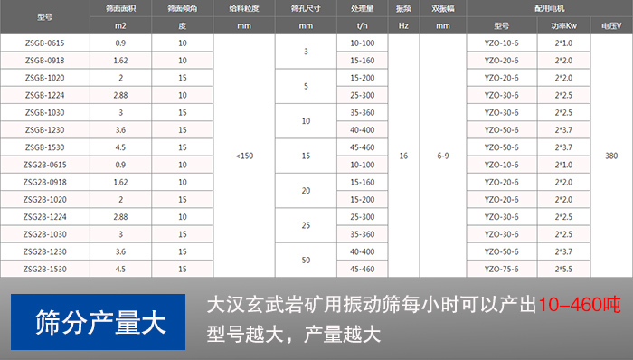 以上是對“玄武巖篩分使用哪種振動篩?”的介紹,大漢ZSG礦用振動篩是個不錯的選擇,設備型號全,用戶選擇多,還可按照用戶工藝要求免費設計,如果您還在尋找一款高效高產(chǎn)的玄武巖振動篩,可以隨時咨詢我們。